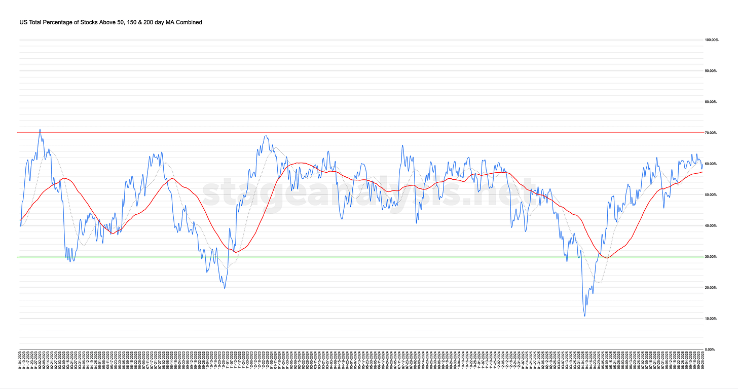➜ Members: login to the website to view the full post: Market Breadth: Percentage of Stocks Above their 50 Day, 150 Day & 200 Day Moving Averages Combined